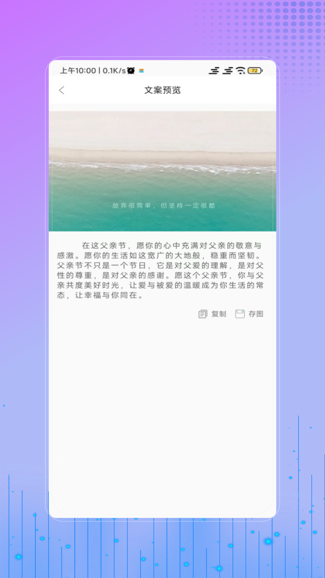 3、平台还支持“多平台分享”功能。用户可将编辑好的文案一键分享至微信、微博、QQ等社交平台,无需切换应用,大大提升了使用效率。同时,分享的文案会保留平台水印,间接为APP引流。