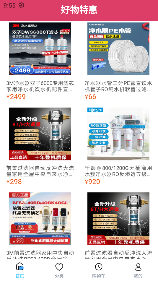 1、净水商城极速版的核心功能是提供全品类净水产品选购服务。用户可通过分类导航或关键词搜索快速定位所需商品,平台覆盖反渗透净水器、超滤机、前置过滤器、滤芯耗材等数百种产品,满足不同水质条件与使用场景的需求。