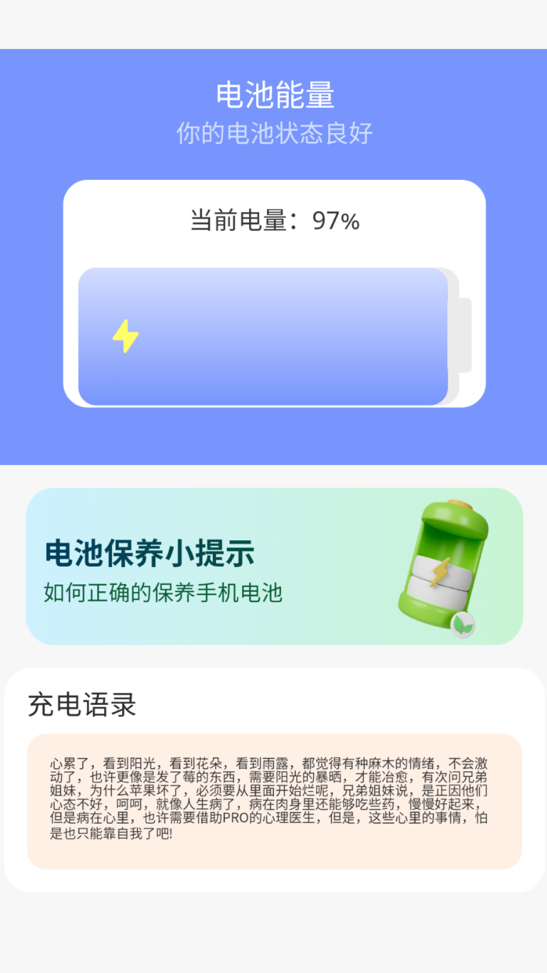 1、**精准电池监控体系**:盛夏快充通过实时数据采集技术,可精确显示充电电流、电池健康度及温度变化曲线。例如,当用户连接充电器时,应用界面会动态展示电压波动范围(如4.2V-4.35V),并标注当前充电阶段(恒流/恒压),帮助用户直观理解充电过程。