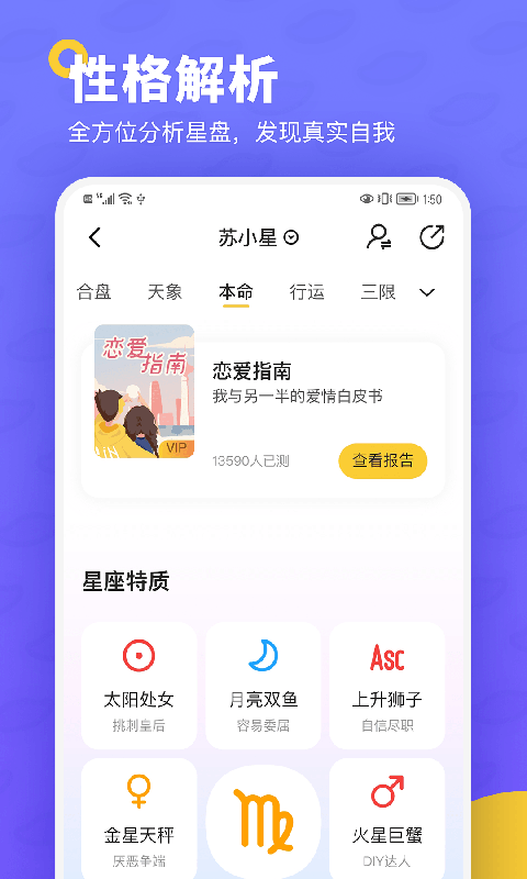 1、AI智能匹配系统:基于用户星盘数据,APP通过算法分析星座兼容性,生成“灵魂契合度报告”。例如,测算两人“金星与火星的相位关系”,判断情感吸引力,或通过“月亮星座对比”评估相处模式,为恋爱、友情提供参考。