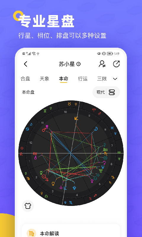 1、星盘生成与分析:用户输入出生信息后,APP自动生成个人星盘,并详细解读太阳、月亮、上升星座等核心要素,结合相位关系分析性格特质与潜在优势。例如,通过“水星相位”判断沟通能力,通过“火星位置”分析行动力,帮助用户更清晰地认识自我。