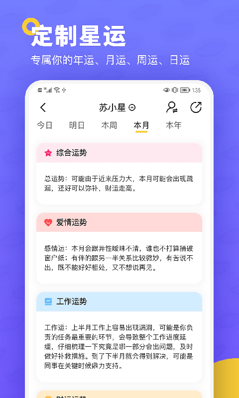 2、运势预测与提醒:每日更新事业、财运、感情等维度的运势报告,并提供“幸运时间”“注意事项”等实用建议。用户可设置提醒,在关键时刻接收运势提示,例如“今日水星逆行,建议谨慎签订合同”,助力生活决策。