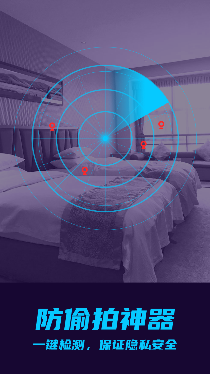 3、**场景化检测指南**:针对不同环境,APP提供定制化检测方案。例如住酒店时,用户可先使用“Wi-Fi设备检测”扫描房间内多余设备,再通过“红点镜头检测”重点排查插座、烟雾报警器等位置;租房场景下,“电磁信号检测”功能可定位隐藏在空调、灯具中的非联网摄像头。