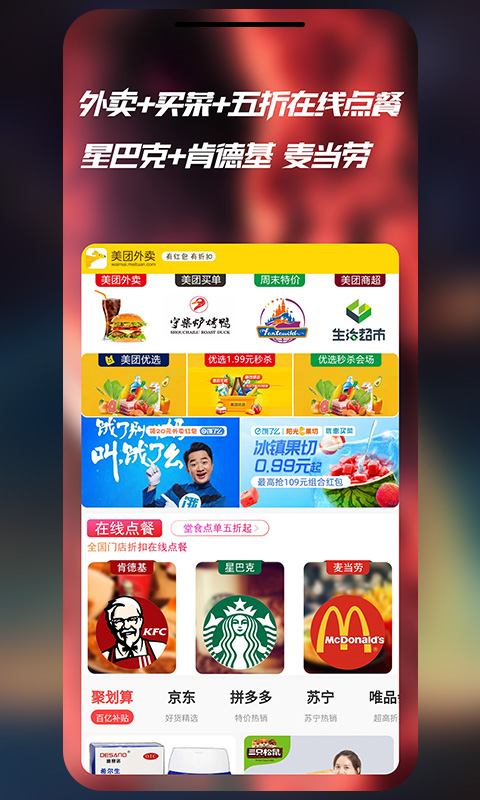 1、**全场景折扣覆盖**:七美乐打通电商与本地生活服务,用户可一键领取淘宝、京东等平台优惠券,同时享受饿了么、美团外卖红包、肯德基/麦当劳在线折扣、美团优选1分购等福利。例如,用户通过平台领取星巴克8折券后,可直接跳转至官方小程序下单,实现“购物+生活”双省钱。