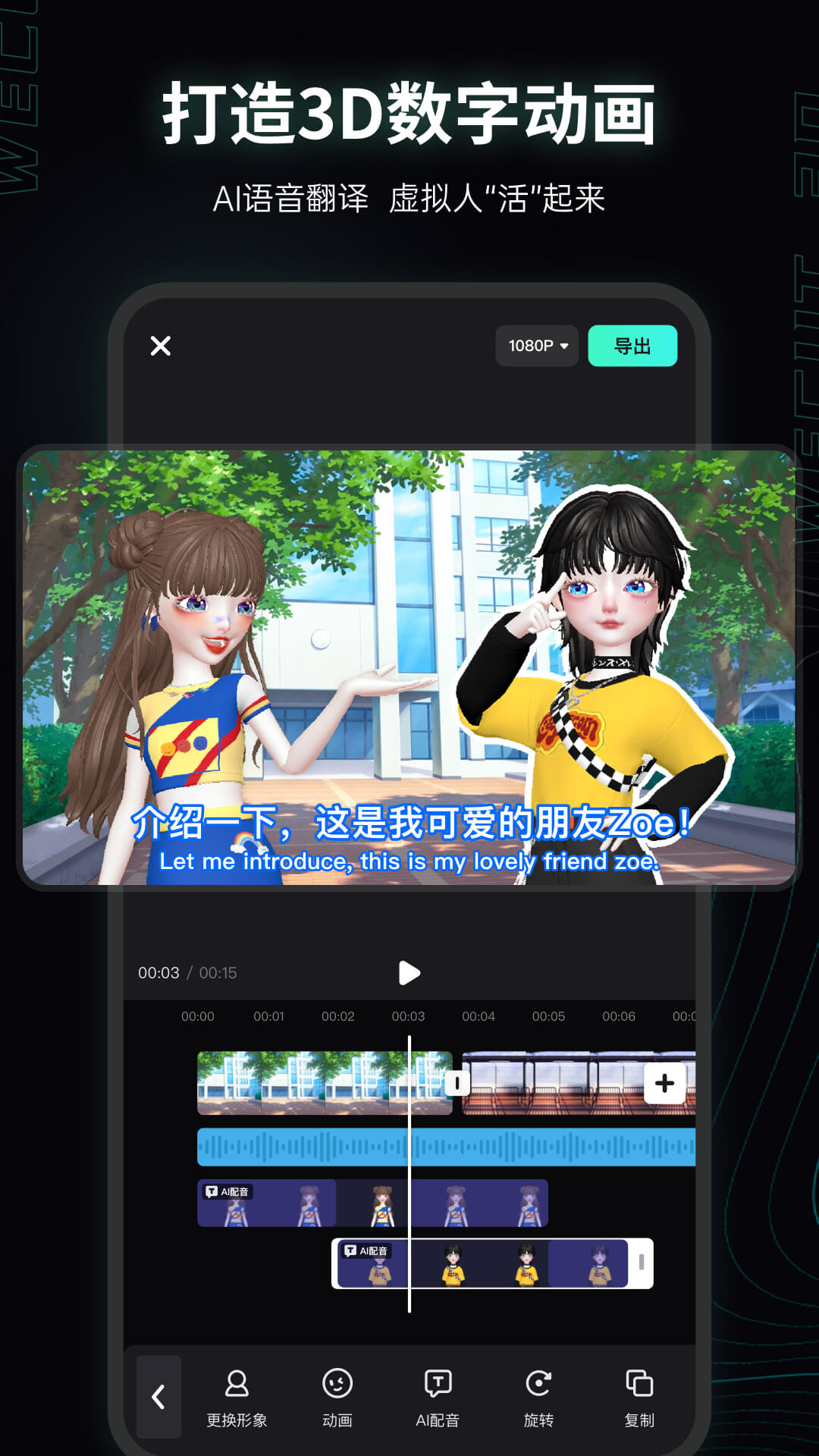 2. **AI驱动的内容生产**:平台搭载AI配音模块,支持文字转语音功能,用户输入台词后,虚拟形象可自动生成匹配口型的语音,化身“全能口播工具人”。这一功能在电商带货、知识科普等场景中广泛应用,帮助用户低成本制作专业级内容。