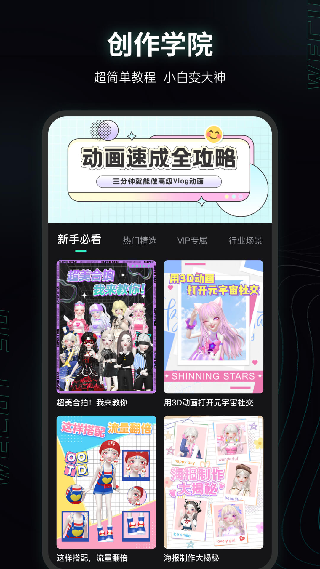 1. **低门槛创作支持**:针对零基础用户,平台提供“微咔3D创作学院”,涵盖从捏脸技巧到视频剪辑的200余节教程,配合步骤指引与案例解析,帮助用户快速掌握核心功能。例如,新手可通过“海报制作五步法”教程,在10分钟内完成从角色选择到背景搭配的全流程操作。