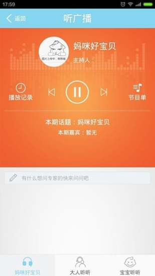 1、**全场景育儿支持**:平台通过“听广播”板块实时播放育儿节目,涵盖孕期护理、婴儿喂养、早教启蒙等内容;“问专家”功能则连接用户与妇幼养护、营养学、医学等领域的专家,支持图文、语音、视频多种咨询方式,24小时内必得专业回复。例如,用户可针对新生儿黄疸、辅食添加等问题直接对话三甲医院儿科医生,获得科学指导。