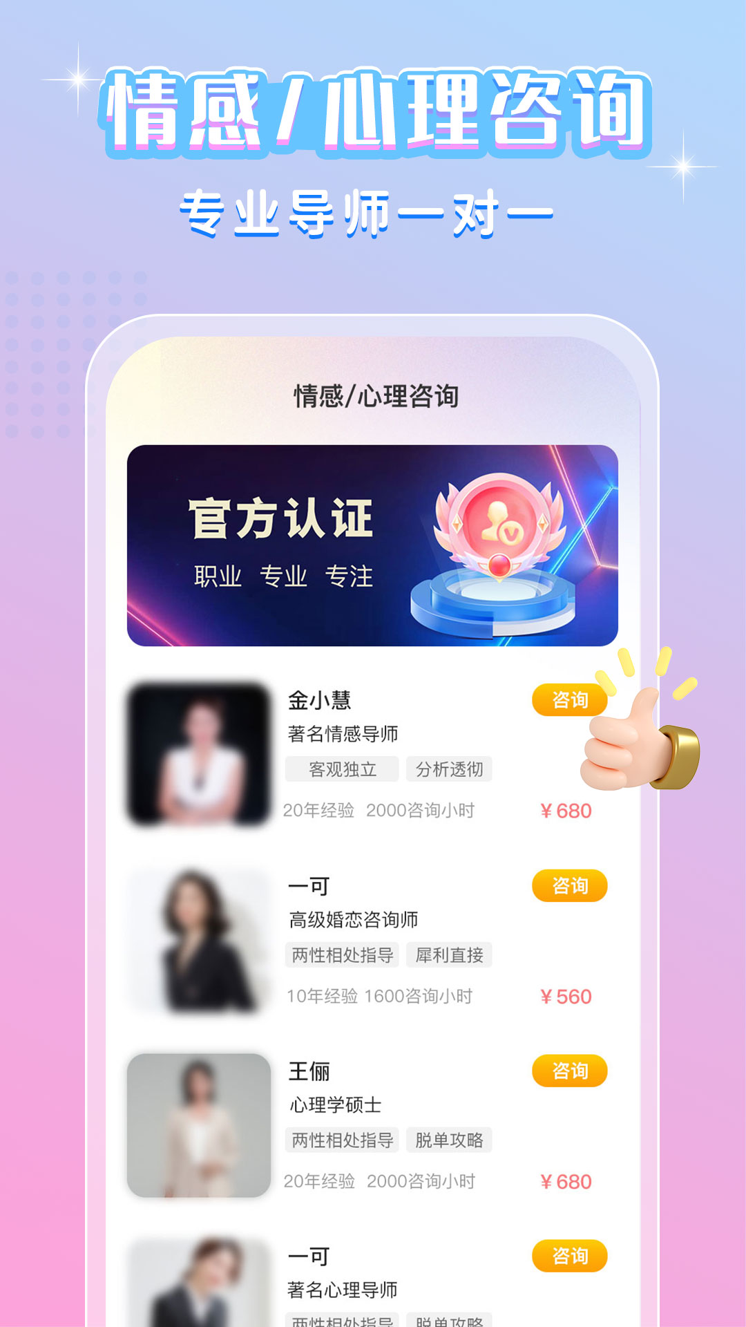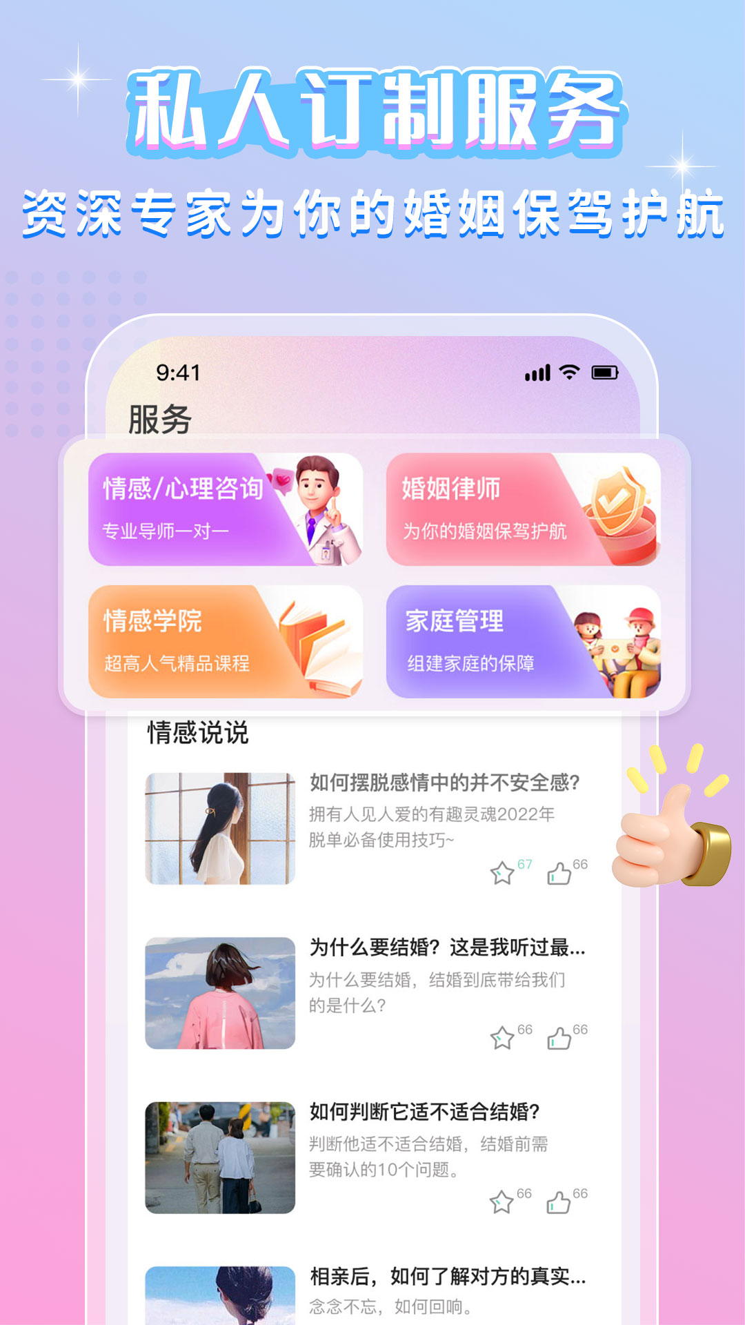 1、**专业情感支持**:联合资深心理咨询师、婚姻律师组建专家团队,提供免费咨询服务。用户可预约“婚前协议指导”“再婚家庭关系调适”等定制课程,2025年服务满意度达92%。