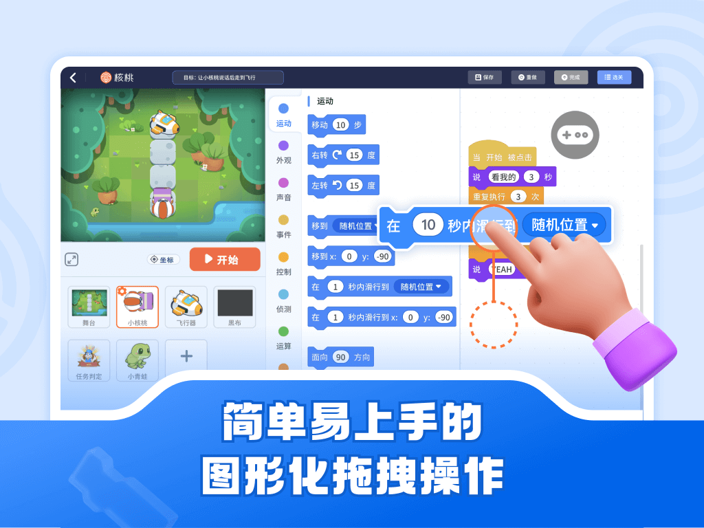 2、**创作与分享社区**:平台提供“自由创作”模块,支持用户利用素材库和云服务搭建游戏、动画等作品,并可一键分享至社区。例如,用户可改编经典故事《龟兔赛跑》,通过编程设计角色互动逻辑,或创作“智能避障小车”模拟现实场景,激发创新思维。