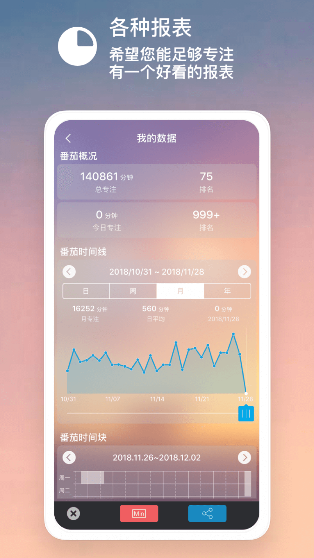 2、**数据统计与分析**:APP内置可视化图表,展示每日/周/月的番茄钟完成情况、专注时长占比、任务类型分布等数据。用户可通过数据复盘优化时间分配,例如发现某类任务耗时过长,可针对性调整计划或提升效率。