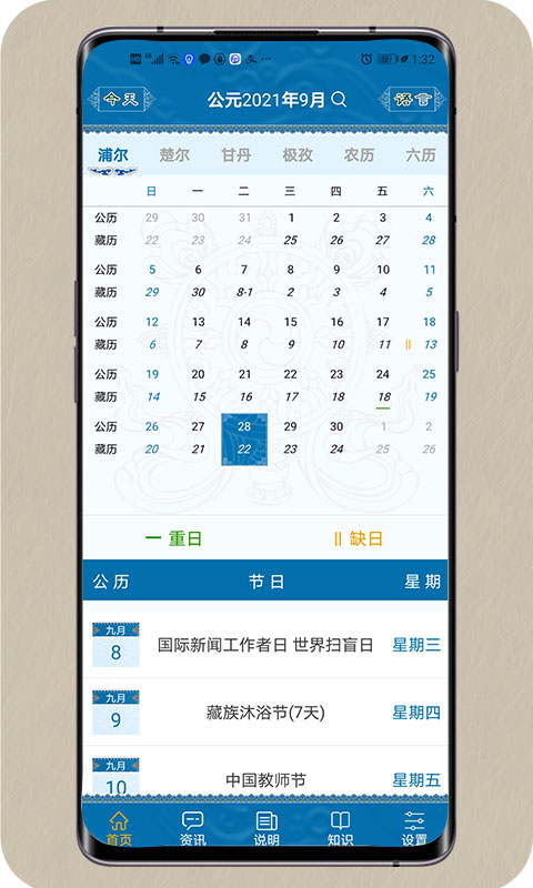 1、**六历对照查阅**:银巴万年历的核心功能之一是支持公历、农历及四大藏历流派的同步显示。用户可在同一界面中对比不同历法的日期差异,例如查询藏历新年对应的公历日期,或对比农历节气与藏历“重缺日”的特殊现象。这一功能极大地方便了历法研究、节日安排及跨文化交流,尤其对需要兼顾藏汉双历的用户群体(如藏族农牧民、宗教人士)具有实用价值。