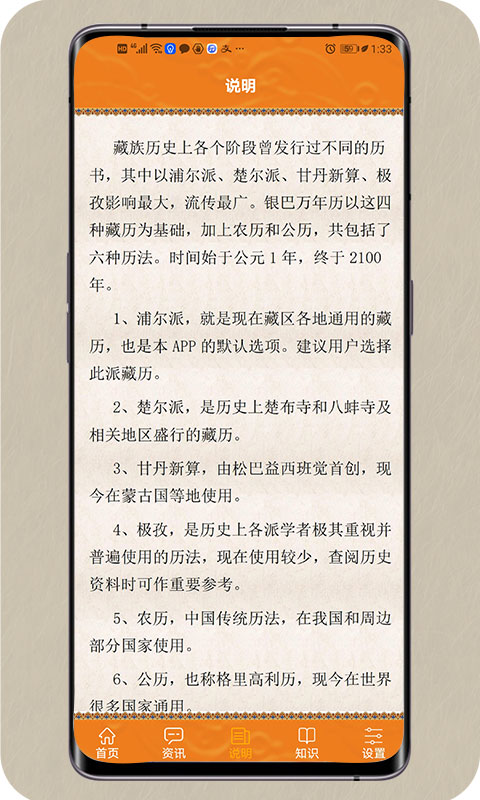 1、**权威数据与专业研发**:银巴万年历的数据由西藏自治区藏医院提供,该机构前身为1916年成立的拉萨“门孜康”(藏医星算院),拥有百年历算研究经验。软件中的藏历数据经过沙盘运算与现代技术校验,确保准确性。例如,藏历“闰月”的计算需结合五行学说与时轮历算,软件通过算法模拟传统运算过程,还原了藏历的复杂性。