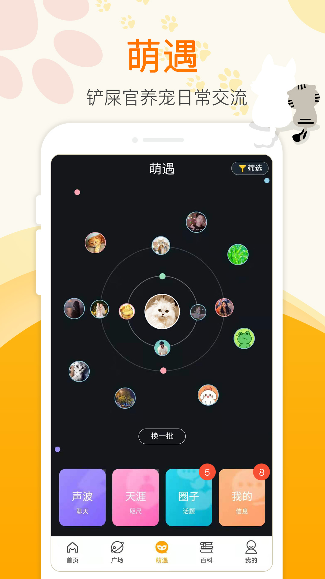 2、**社交互动精准匹配**:基于宠物品种、地理位置的“萌遇”匹配系统,可为用户推荐同城养宠好友。广场模块聚合用户动态,设置“萌宠挑战”“喂养技巧”等话题专区,2020年7月上线的“人气宠物榜”功能,通过互动数据生成区域热度榜单,激发用户参与热情。