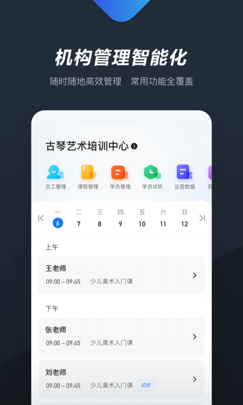 1、**移动化办公场景**:教师可通过手机完成考勤签到、课时确认等操作,管理者可随时随地审批请假申请、查看经营日报。某书法培训机构负责人表示:"以前查课表要跑办公室,现在地铁上就能处理完所有审批。"