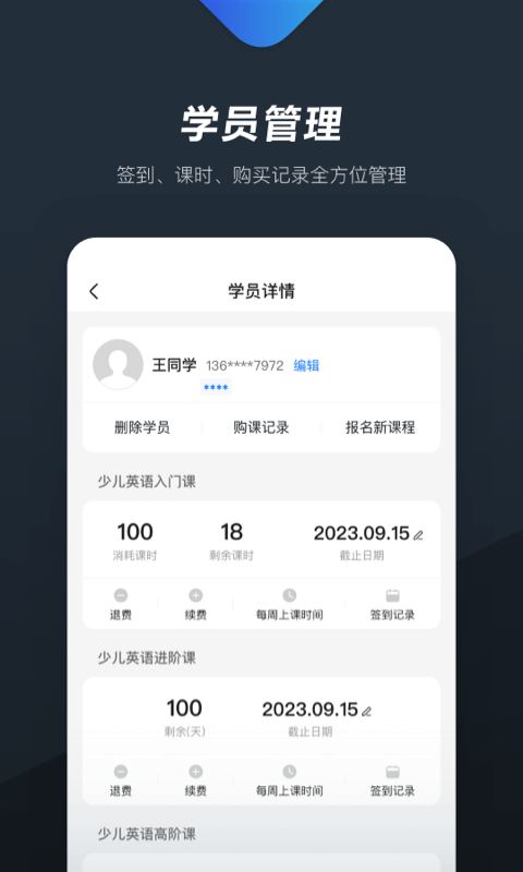2、**会员制课程深度管理**:系统支持会员期限、剩余天数、截止日期等精细化管理,学员签到与请假记录自动关联会员权益。某编程培训机构通过会员数据分析,推出"老带新"奖励计划,3个月内会员续费率提升18%。