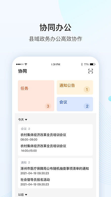 1、**协同办公中枢**:平台集成通知公告、会议安排、任务调度三大核心功能,基层工作人员可通过“协同”页面一屏查看近期工作安排。例如,镇政府发布的防汛任务可实时推送至村干部手机端,任务完成进度自动留痕,避免传统纸质记录的低效与易丢失问题。