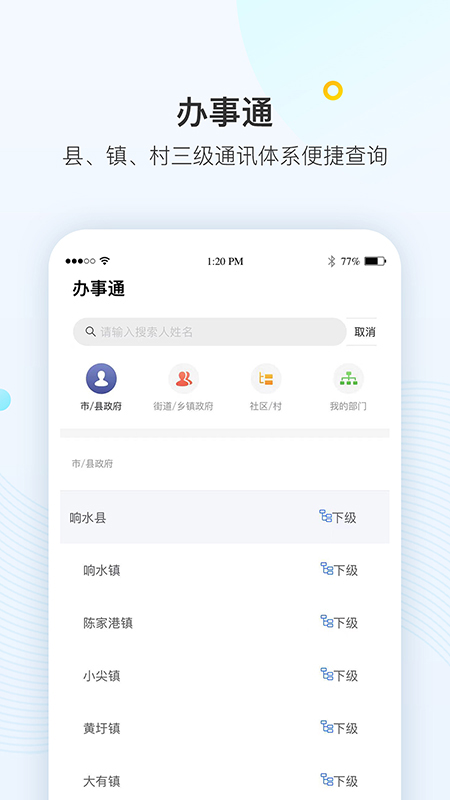 2、**三级通讯体系**:县、镇、村通讯录嵌入“办事通”模块,支持按部门、姓名快速检索联系人。某村委干部曾反馈,通过平台直接联系县农业农村局专家咨询种植技术,较以往层层转达节省了2-3天时间,显著提升跨层级协作效率。