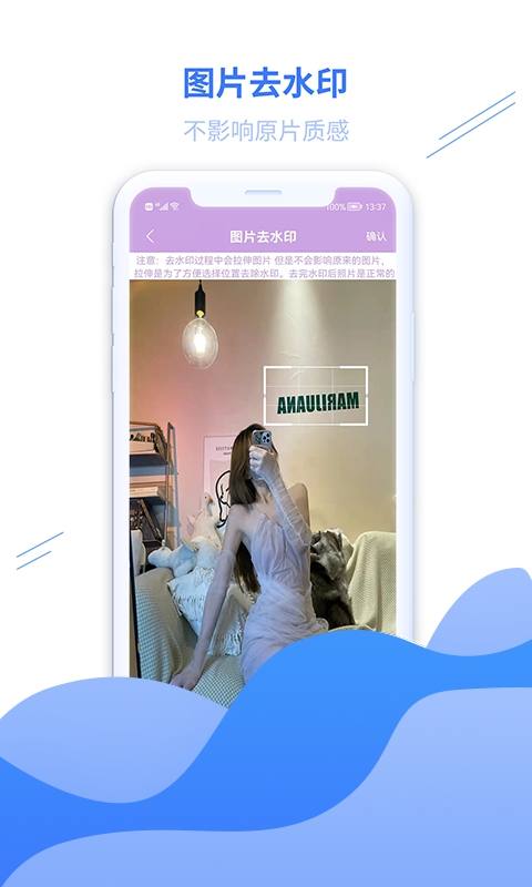 1、智能去水印:APP采用AI算法,可自动识别图片中的水印区域,通过模糊填充、纹理匹配等技术实现无缝修复。用户只需框选水印位置,系统即可快速处理,无需手动调整参数,适合非专业用户使用。