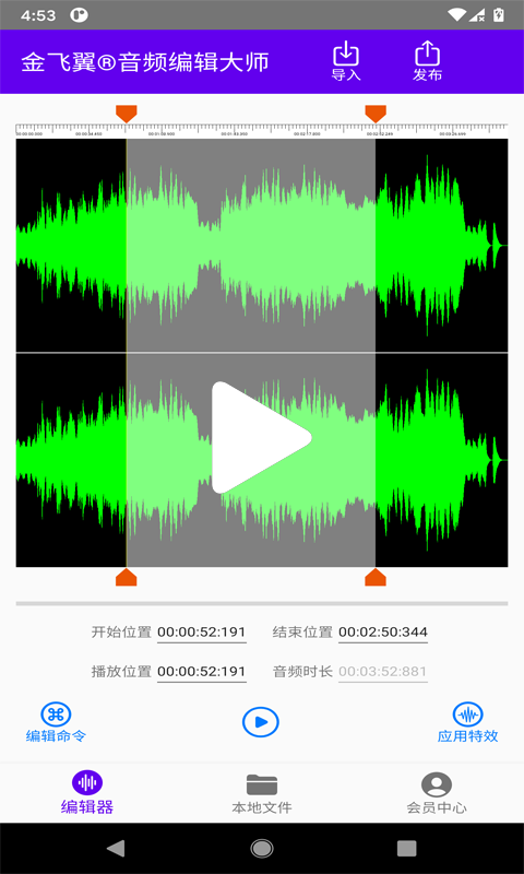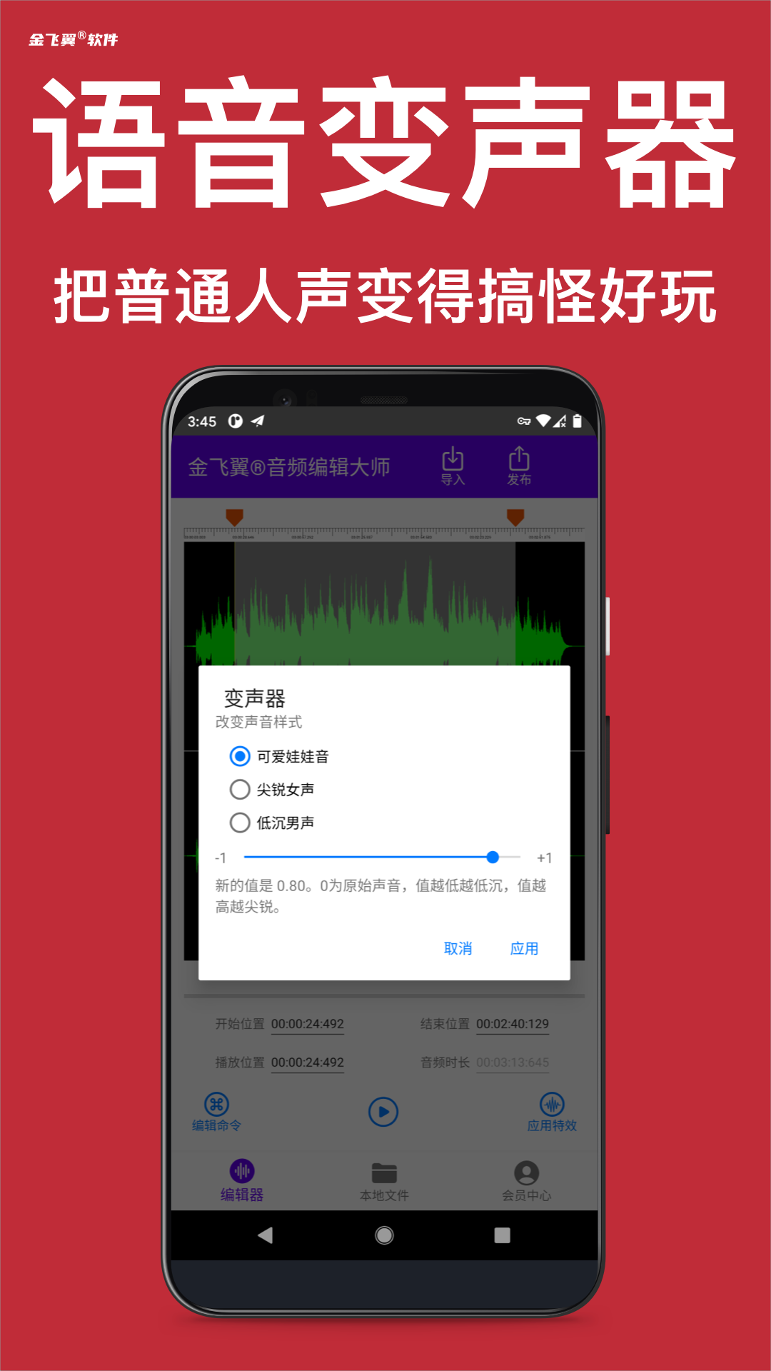 3、**创意特效支持**:内置变声器可实现娃娃音、低沉男声等效果,适用于游戏配音或短视频创作。播放变速功能支持0.5倍至2倍速调整,既可用于制作鬼畜视频,也能帮助语言学习者练习听力。淡入淡出特效则让音频过渡更自然,避免突兀的剪辑痕迹。
