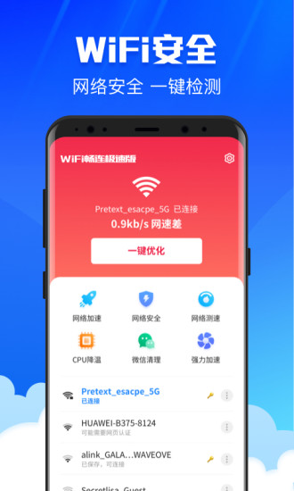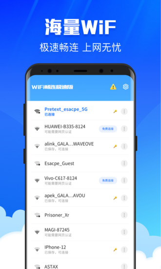 WiFi畅连极速版是一款专为安卓用户设计的智能网络管理工具,集WiFi搜索、安全检测、网络优化于一体。通过AI算法快速扫描周边可用WiFi,支持一键免密连接,同时内置病毒查杀、流量监控、垃圾清理等实用功能。软件界面采用极简设计,操作逻辑清晰,即使对技术不熟悉的用户也能快速上手。其核心优势在于将网络安全与性能优化深度融合,既能保障用户隐私,又能显著提升网络速度,尤其适合经常外出、需要频繁连接公共WiFi的移动办公人群。