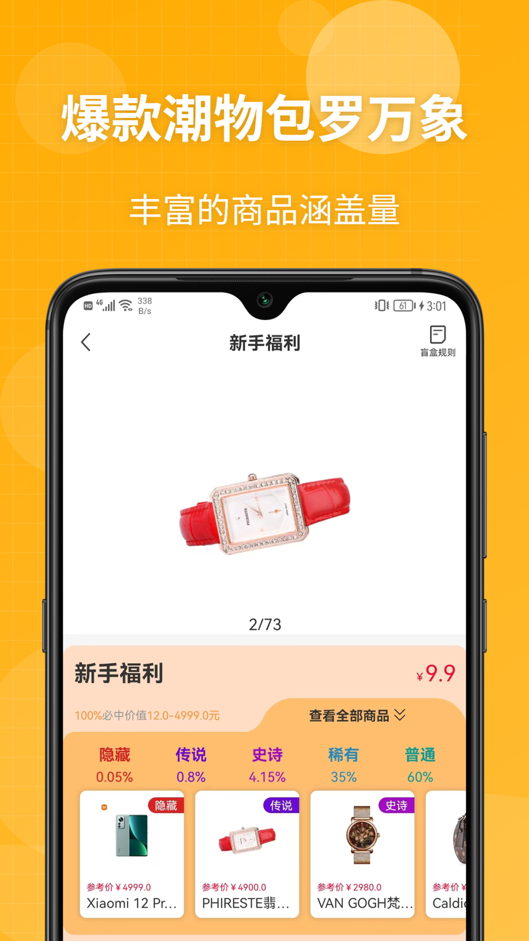2、**全品类商品池**:平台商品覆盖潮玩手办、数码产品、美妆护肤、网红食品等20余个细分领域,与泡泡玛特、萌奇等品牌达成正版授权合作。用户可能以低价抽到价值千元的手办,也可能获得品牌小样,这种不确定性激发了持续消费欲望。