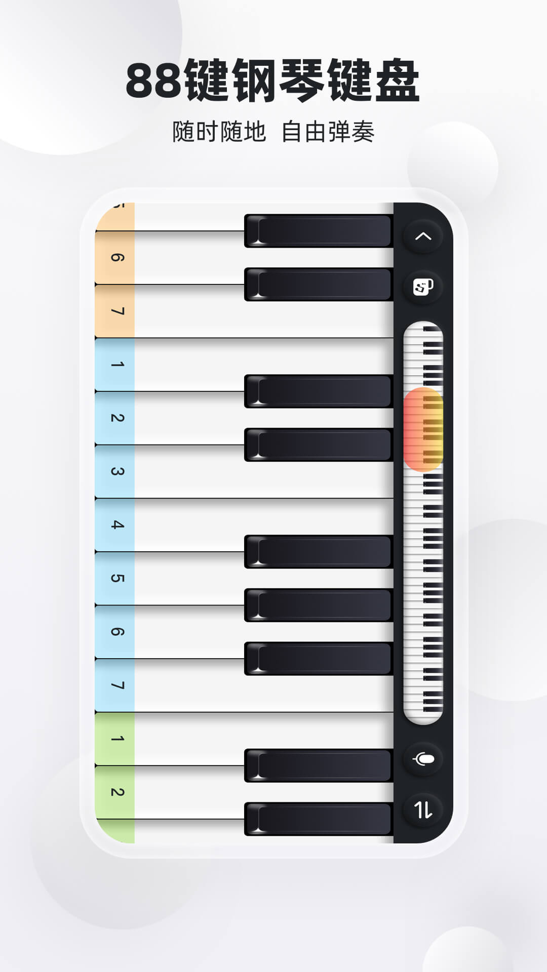 2、多模式演奏功能是另一大亮点,除了标准钢琴模式外,还提供电钢琴、管风琴、古钢琴等8种音色切换。用户可自由调整琴键灵敏度与踏板效果,甚至通过麦克风录制环境音作为背景伴奏。在"自由演奏"模式下,系统会实时生成和弦建议,帮助用户即兴创作,激发音乐灵感。