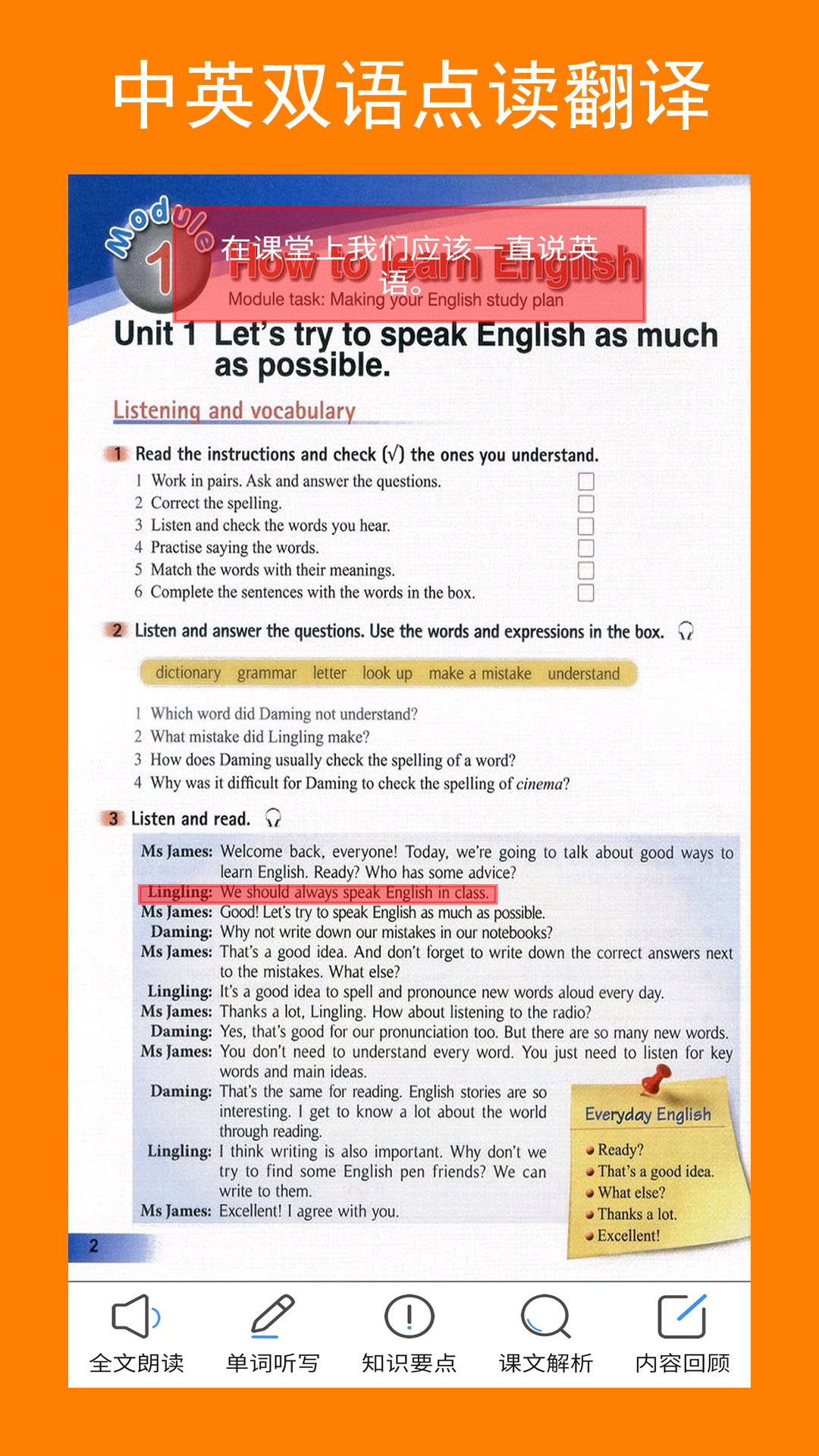 1、教材同步学习:APP完整收录八年级上册教材内容,按单元划分词汇表、课文原文、语法详解,学生可随时调取教材音频,跟读模仿标准发音,或通过“点读”功能精准定位难点,实现无纸化学习。