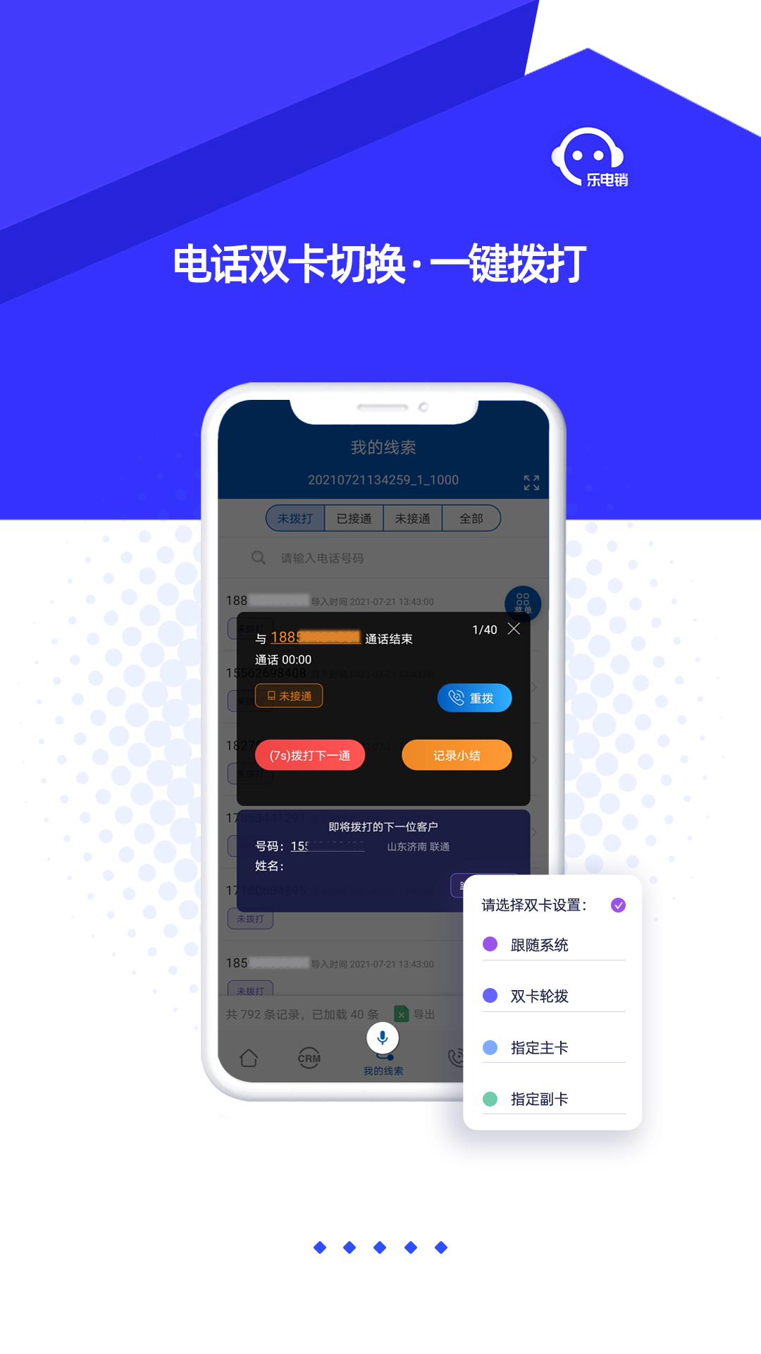 1、**智能拨号与防封卡技术**:乐电销APP的核心功能之一是自动拨号系统,支持一键导入号码列表并自动过滤空号、停机号等无效号码,确保每次外呼的精准性。针对高频外呼导致的封卡问题,APP采用双卡轮拨技术,当主卡达到运营商限制时自动切换至副卡,结合回拨与群呼功能,有效规避封号风险。例如,某金融销售团队使用后,日外呼量从200通提升至500通,封卡率下降80%。