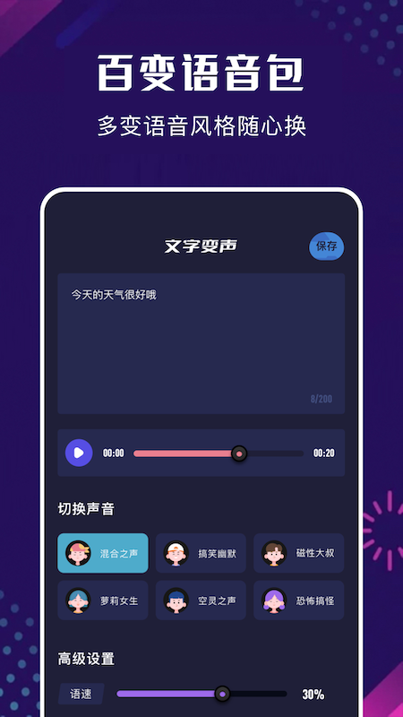 3、语音包库:内置海量热门语音包,包括明星模仿、方言搞笑、影视经典台词等。用户可直接套用模板快速生成内容,也可将自定义语音保存为语音包,供后续重复使用。