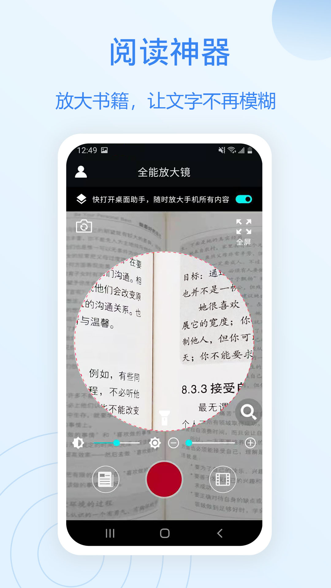 全能放大镜是一款集多场景实用功能于一体的智能工具类APP,专为解决用户日常生活中的细节观察需求而设计。无论是阅读微小文字、查看高清图片细节,还是识别物品信息、辅助视力障碍者,这款APP都能通过先进的图像处理技术和AI算法,提供清晰、精准的放大效果。其界面简洁易操作,支持手势缩放、滤镜调节、实时截图分享等功能,同时涵盖文字识别、物体测量、颜色分析等扩展工具,真正实现“一镜多用”。无论是学生、上班族还是中老年群体,都能通过全能放大镜轻松应对各类观察场景,成为生活中不可或缺的智能助手。