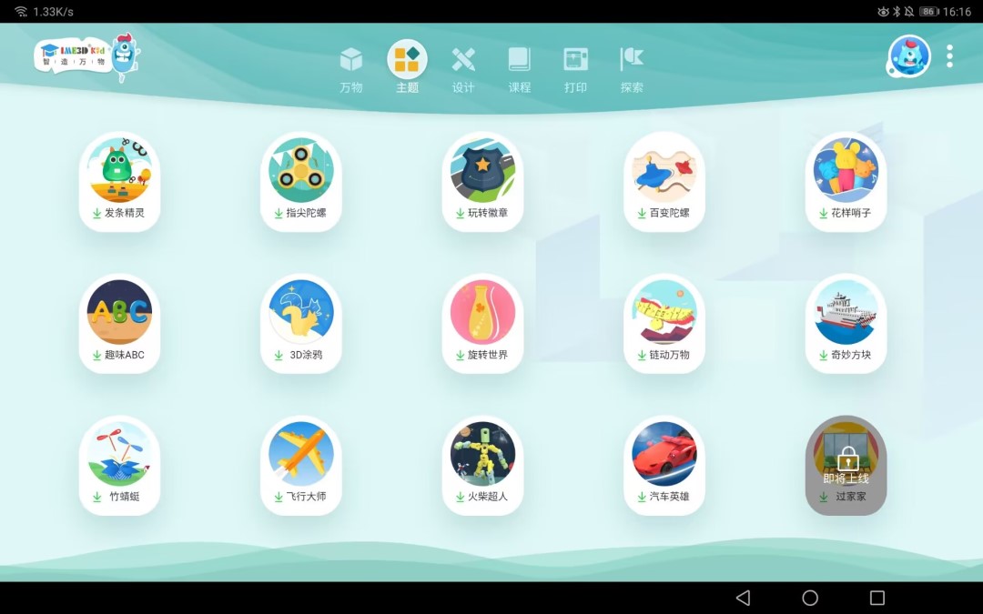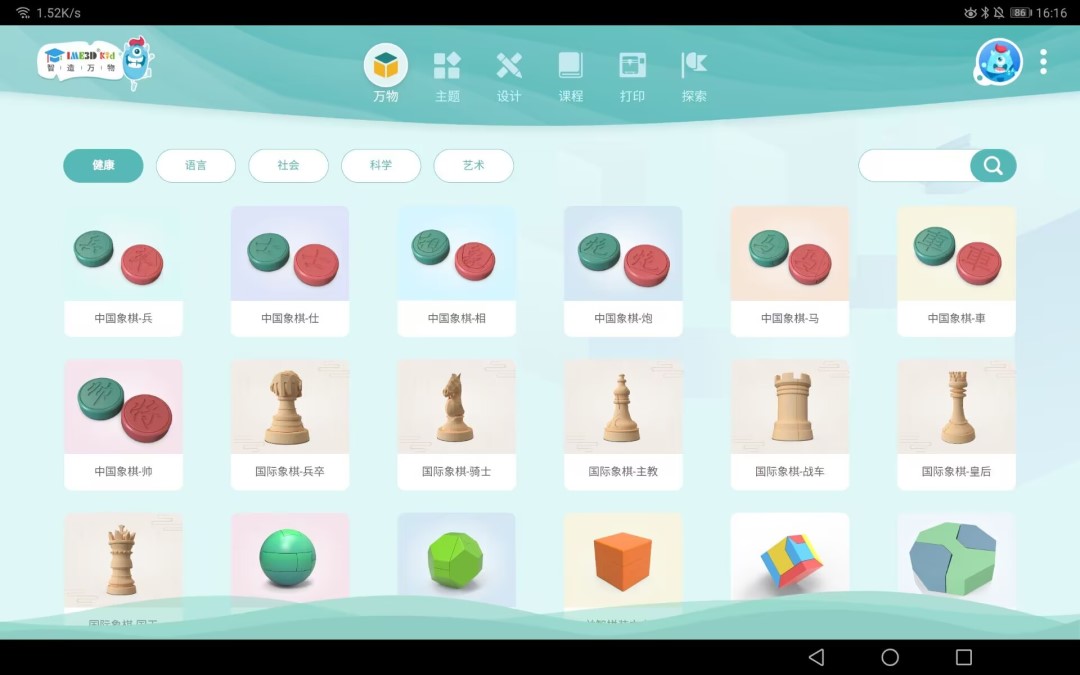 1、**主题式创意设计**:平台提供“趣味ABC”“节日工坊”“积木大师”等20余款主题APP,每款对应特定创作场景。例如“趣味ABC”将字母与动物、交通工具结合,孩子可设计“河马造型的A字母”或“西瓜形状的数字3”,在拖拽拼接中掌握结构认知,同时生成可打印的3D模型。