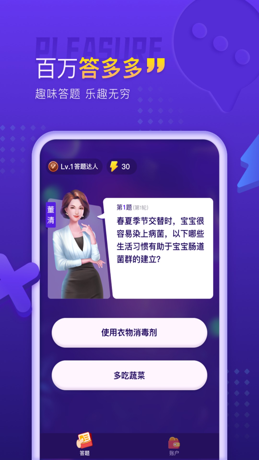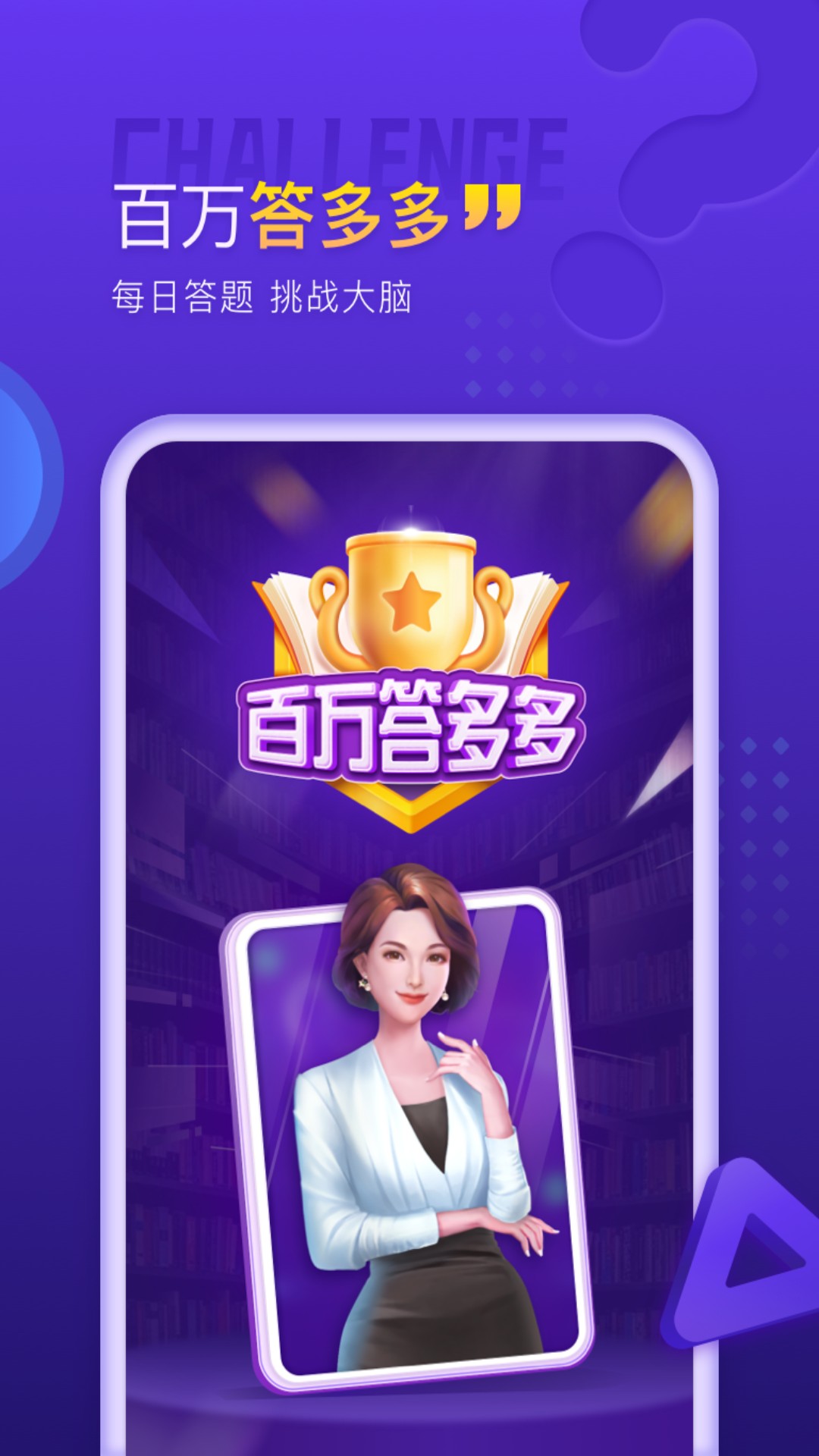 “百万答多多”是一款以知识问答为核心玩法的互动型APP,集趣味性、挑战性与社交性于一体。用户通过参与限时答题、好友对战、主题闯关等多样化模式,既能检验自身知识储备,又能赢取现金红包、积分奖励等丰厚福利。平台涵盖历史、科技、娱乐、生活等20余个领域,题目难度由浅入深,满足从新手到资深玩家的不同需求。此外,APP内置实时排行榜、好友互动、组队挑战等功能,让用户在答题过程中享受竞技快感,同时通过社交裂变机制提升用户粘性,打造“边学边赚”的全新体验。