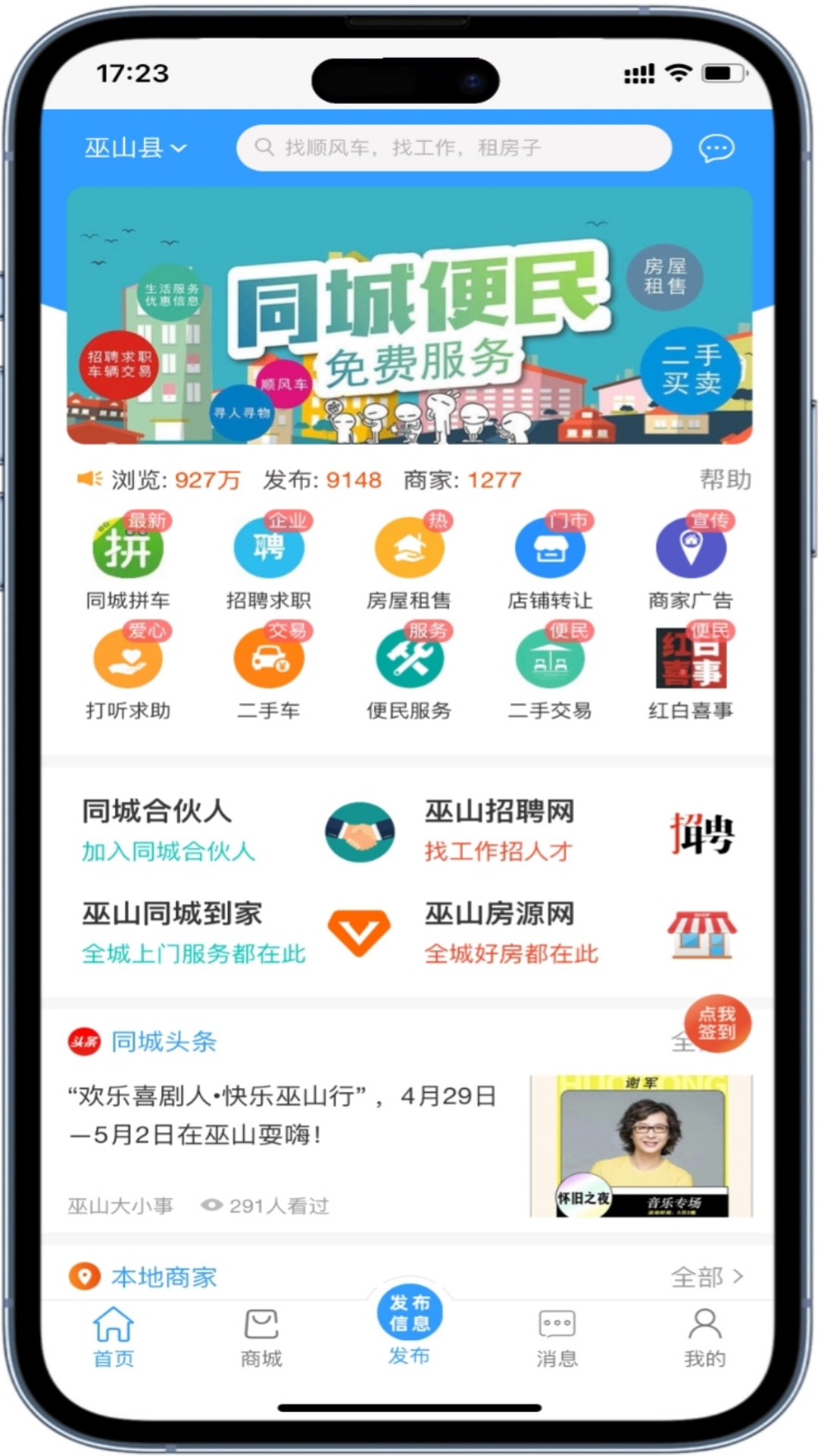 巫山万事通是一款专为巫山地区居民打造的综合性生活服务类APP,由重庆渝东文化传媒有限公司开发运营。作为区域同城生活化综合平台的标杆,该应用深度整合本地资源,覆盖房产租售、招聘求职、二手交易、家政服务、同城跑腿等核心生活场景,同时提供实时新闻资讯、天气预报、广播收听等便民功能。用户可通过手机端快速查询本地商家信息、参与优惠活动,甚至实现线上点单、房屋租赁签约等操作,真正实现“足不出户,通晓巫山”。截至2025年10月,其最新版本已迭代至3.6.1,支持安卓与iOS双平台,累计服务用户超百万,成为巫山市民日常生活中不可或缺的“数字助手”。