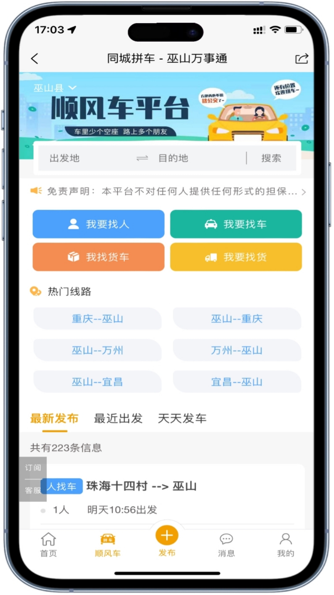 2、**实时资讯与社交互动**:应用内置“本地头条”频道,实时推送巫山政务动态、民生新闻、文旅活动等内容,用户可评论、转发参与讨论。此外,平台设有“同城社交”功能,支持用户发布拼车、交友、求助等需求,例如五一假期期间,用户通过“拼车信息”板块快速找到同行伙伴,既节省成本又增进社交联系。