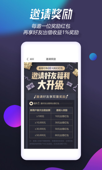 3、**新人激励与社交裂变**:新用户注册即领188元红包,首笔投资享9.0%年化收益,完成首单再获700元红包+1%加息券。邀请好友机制下,用户可获好友每笔收益的1%返现,二级好友贡献0.5%,形成“老带新”的良性循环。数据显示,该功能使平台用户月均增长率达15%。