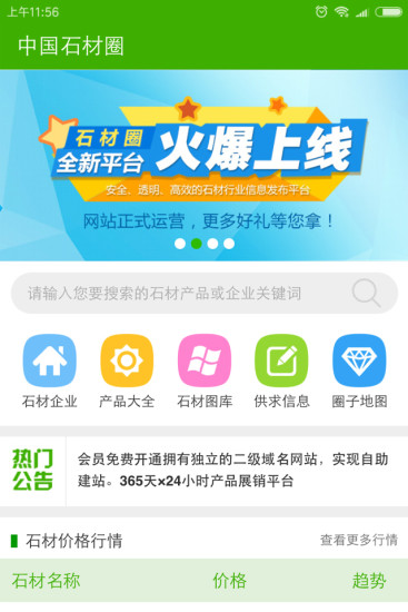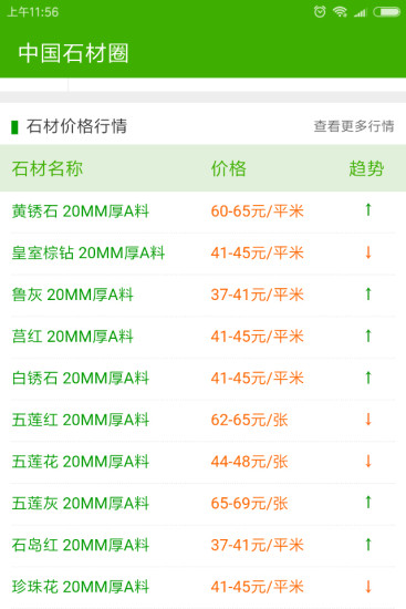 2、**行情动态实时推送**:基于全国30个主要石材市场的价格数据,APP每日更新“热门石材价格指数”,并推送区域性价格波动预警。如广东云浮产区花岗岩价格单日上涨5%,系统会向周边采购商发送提醒,辅助决策。