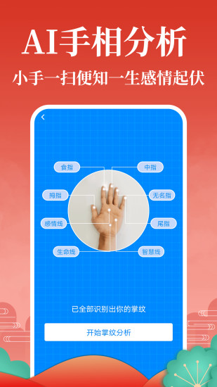 3、面相手相解读:通过上传面部或手掌照片,APP利用AI图像识别技术,分析五官比例、掌纹特征,解读性格、健康、财运等隐含信息,为用户提供直观的自我认知工具。