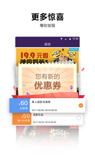 3、优惠活动中心定期推出限时折扣、满减券和抽奖活动,联合影院推出“早鸟票”“午夜场特惠”等场景化优惠,用户可通过分享活动至社交平台获取额外奖励。