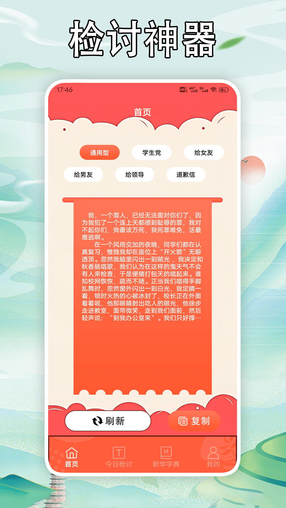 3、实时更新模板库:开发团队定期根据用户反馈优化模板,新增热点场景(如“线上会议迟到”“社交平台不当言论”),确保内容与时俱进,避免因模板过时导致检讨书缺乏针对性。